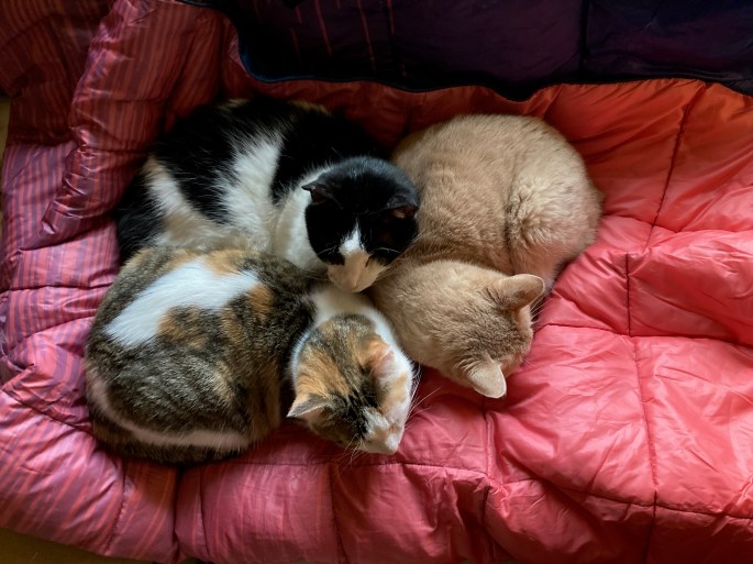 Most importantly: the cats love them! These will be great not just for the trip over, but will be permanent fixtures in our apartment for those chilly days. They add such a bright spot of color to any room! And pack down into a little matching bag for easy transport and storage.