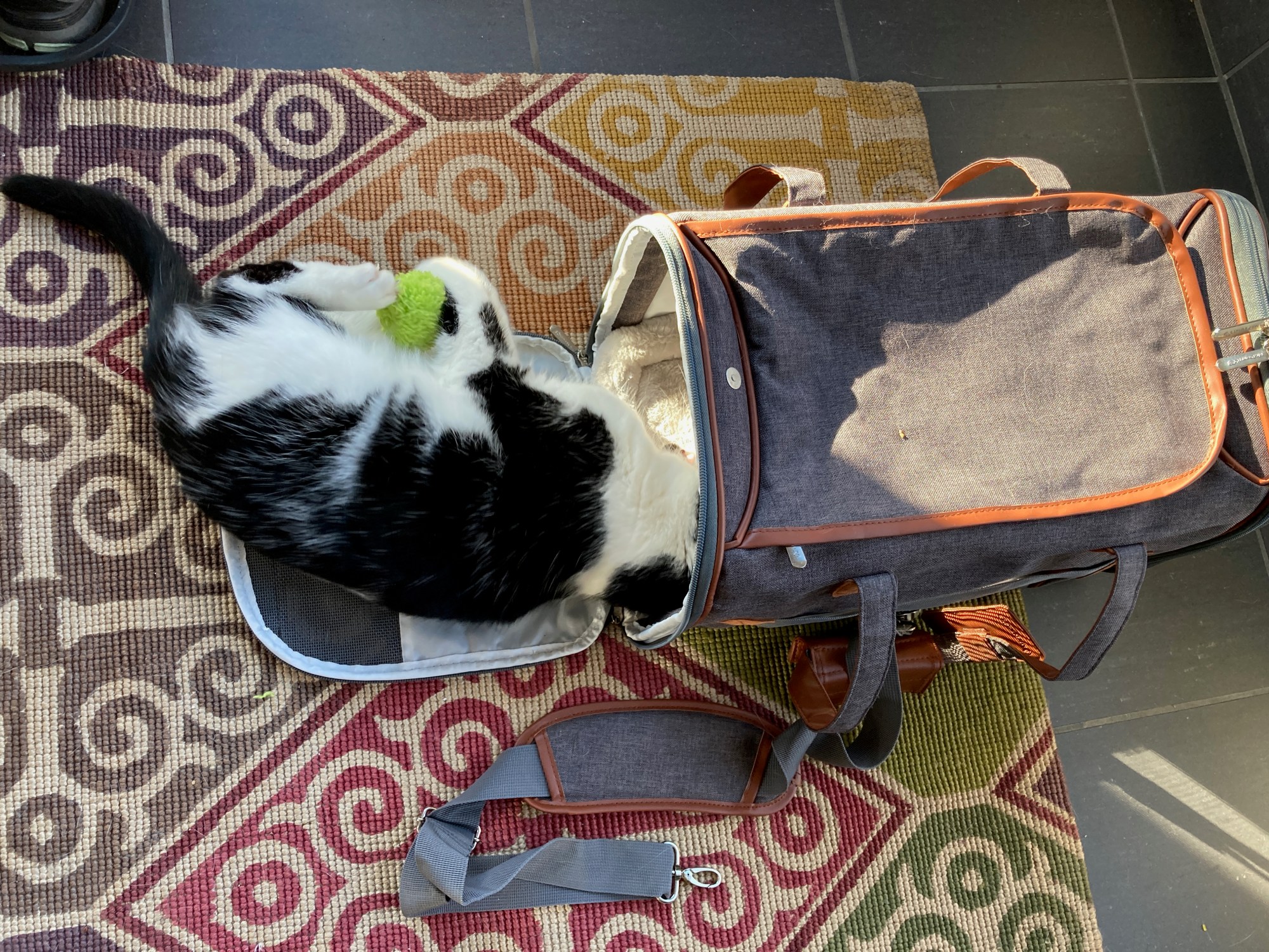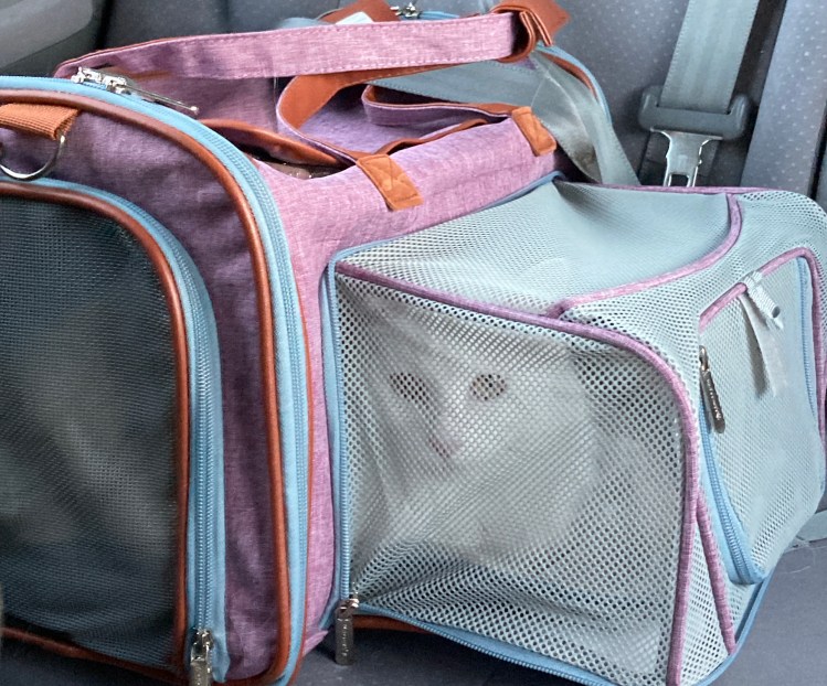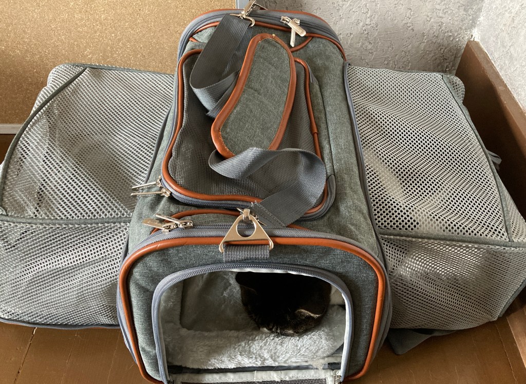 Since there are two humans and eight felines on this adventure, we needed to maximize the number of cats each person could carry. Also, since we originally thought we’d be driving 9 hours to meet the charter flight, we liked the idea of getting carriers that had pop-out sides to give the kitties a little more room to move around. This also seemed like a good option if we wanted to combine two cats in one carrier.