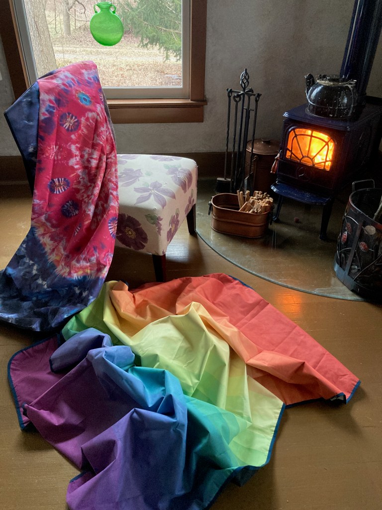 The pads are fun and colorful, and fold into a little attached pouch for easy carrying. The bottom is waterproof, and the top is a soft polyester microsuede.