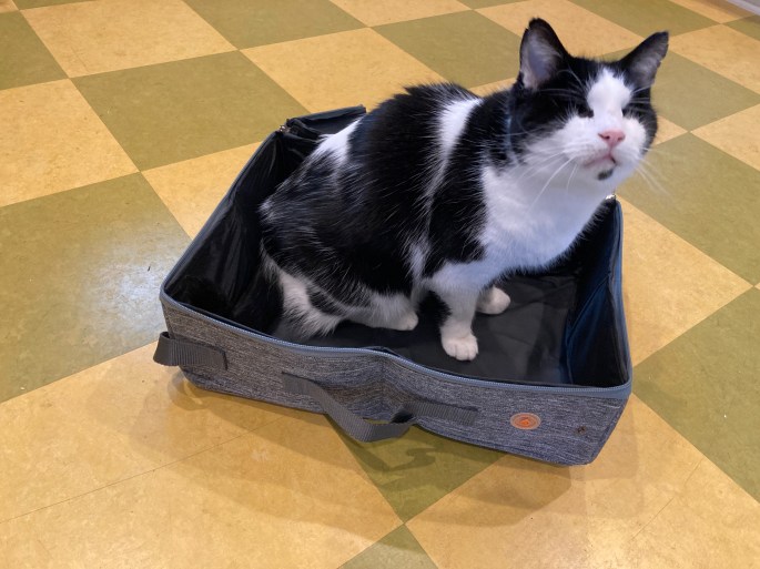 Still, we wanted to give them the opportunity, and when we first started thinking about traveling, we always assumed we’d need to drive for a day, overnight in a hotel, and fly the next day. That would mean we’d definitely need to come up with something we could use as a litter box along the way.